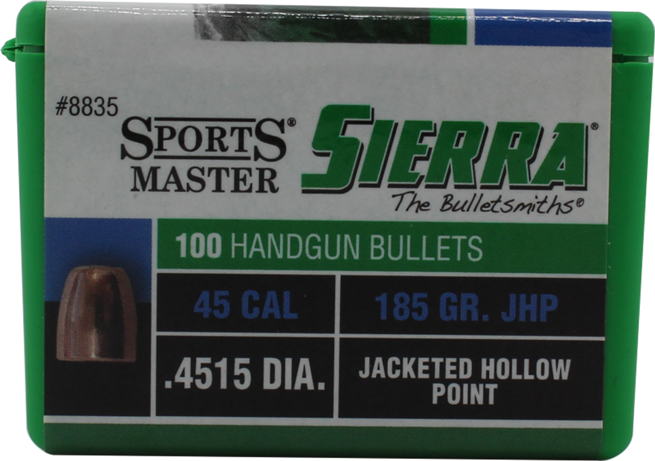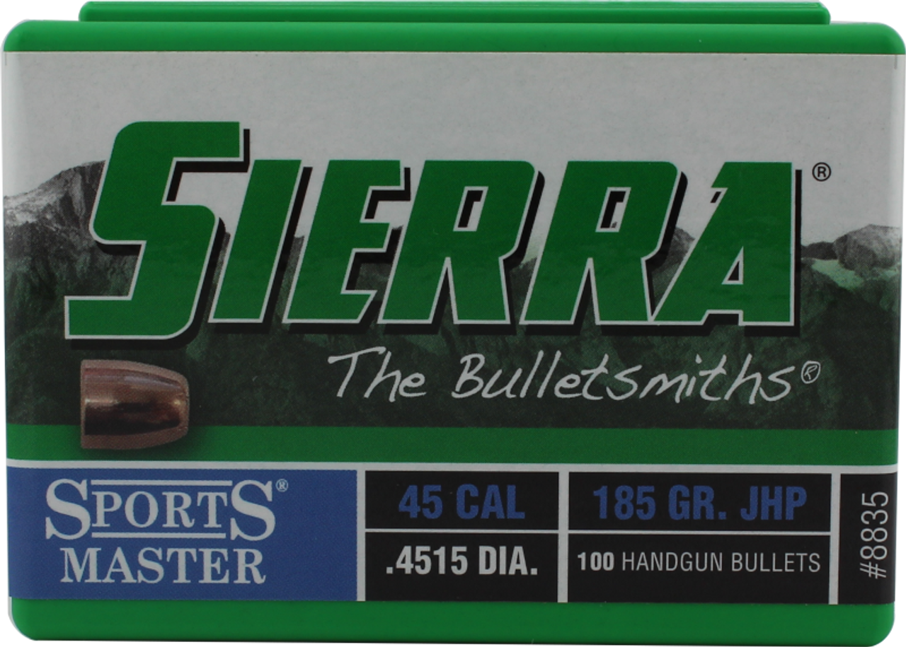 Sierra’s new #8835 185gr JHP Sports Master is a redesign of our original #8800. It has a smooth transition from the bearing surface to the ogive, and a rounder ogive profile, as well as a new hollow cavity in the nose. These new features have created a bullet that has given us a very good expansion quality and reliability from velocities associated with the 45ACP cartridge. It was originally designed for use from the 45ACP but can be used in others like the 45 Auto Rim and even the 45 Colt when certain conditions are met.