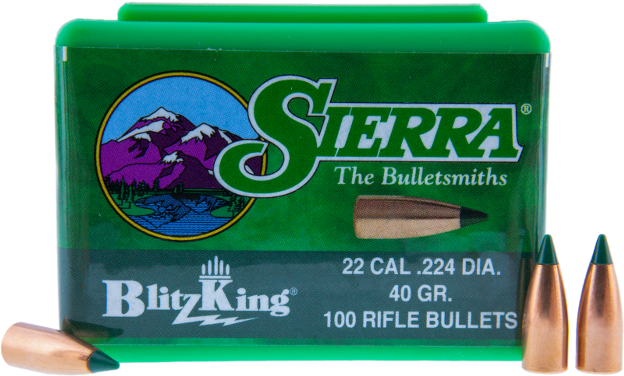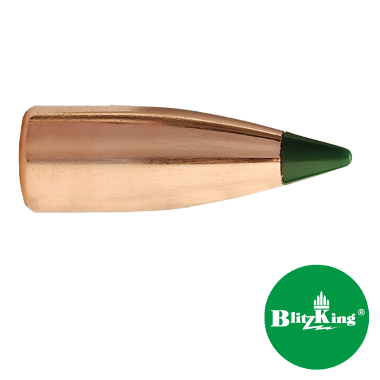 For rifles, this bullet is designed for explosive expansion in varmints and small game and with accuracy characteristic of the MatchKing bullets. The nose tips of this bullet is made of a proprietary acetyl resin compound, and the sharp tips improve the ballistic coefficient over the traditional flat-base Spitzer bullet design. The 40 grain BlitzKing #1440 has a flat base. All the BlitzKing bullets in 22 caliber are designed to be fired at muzzle velocities up to 4400 fps.